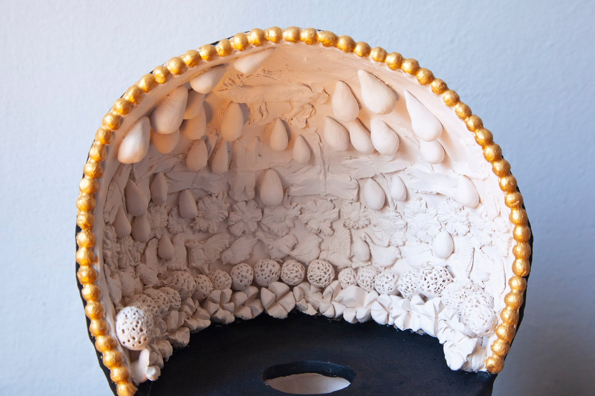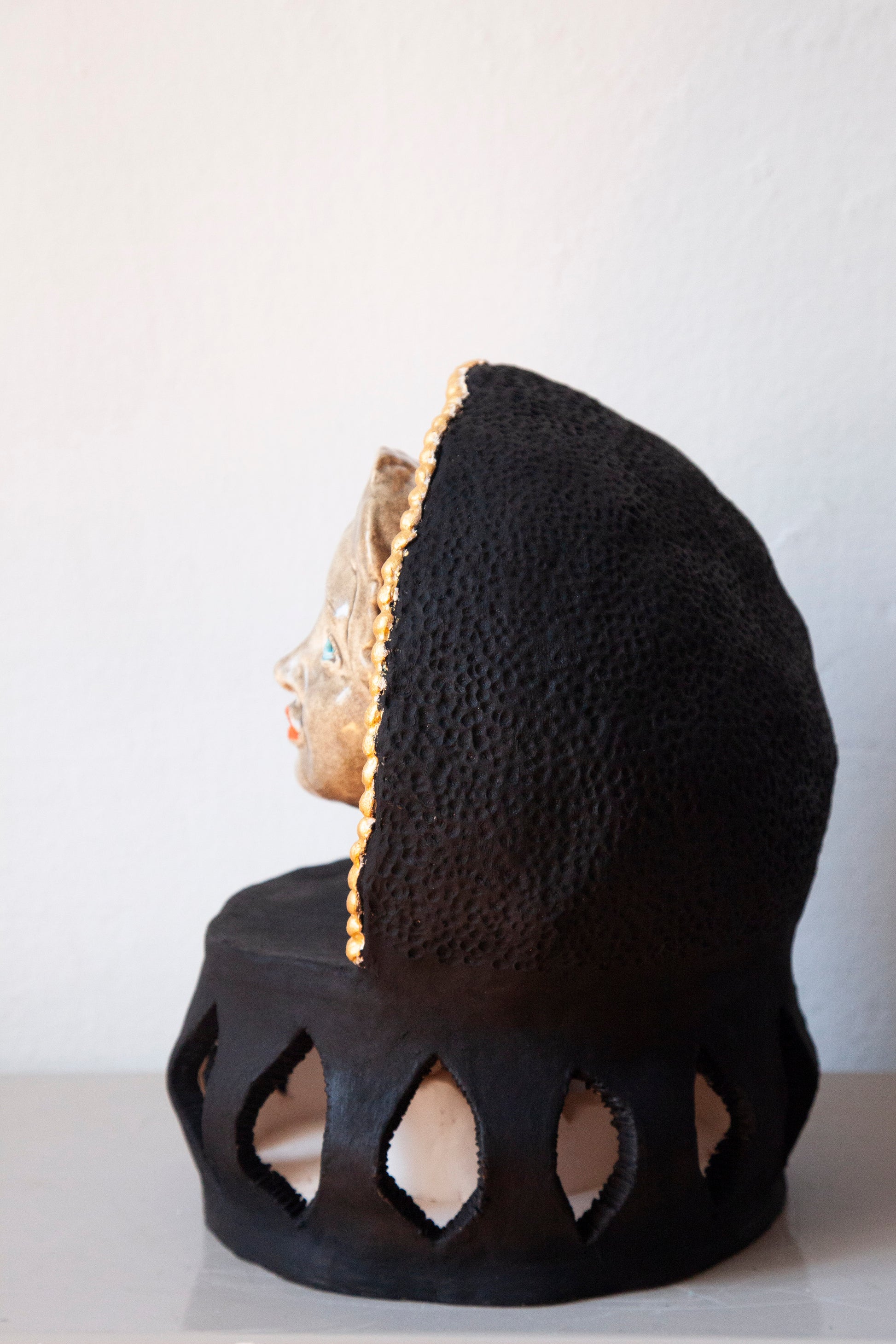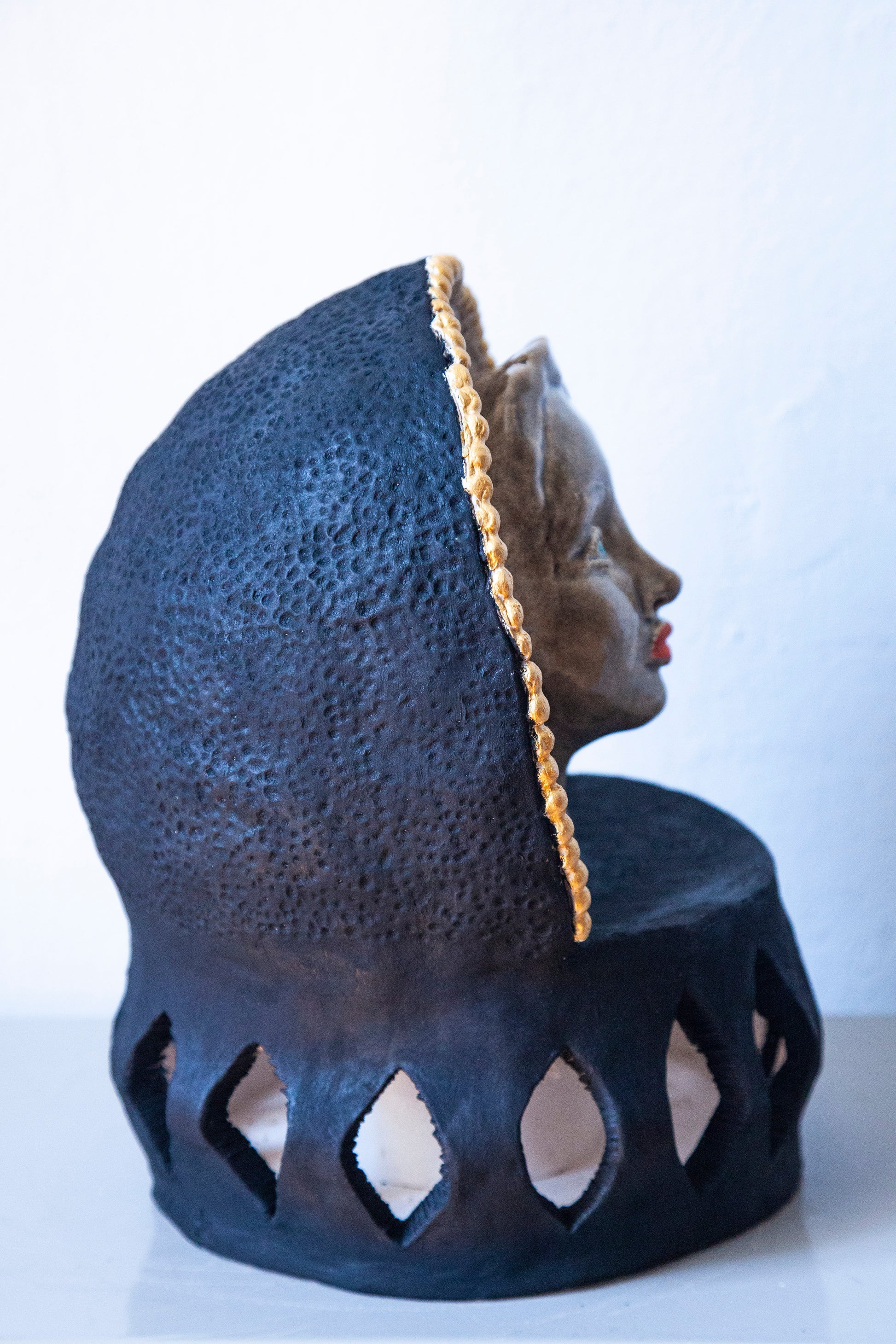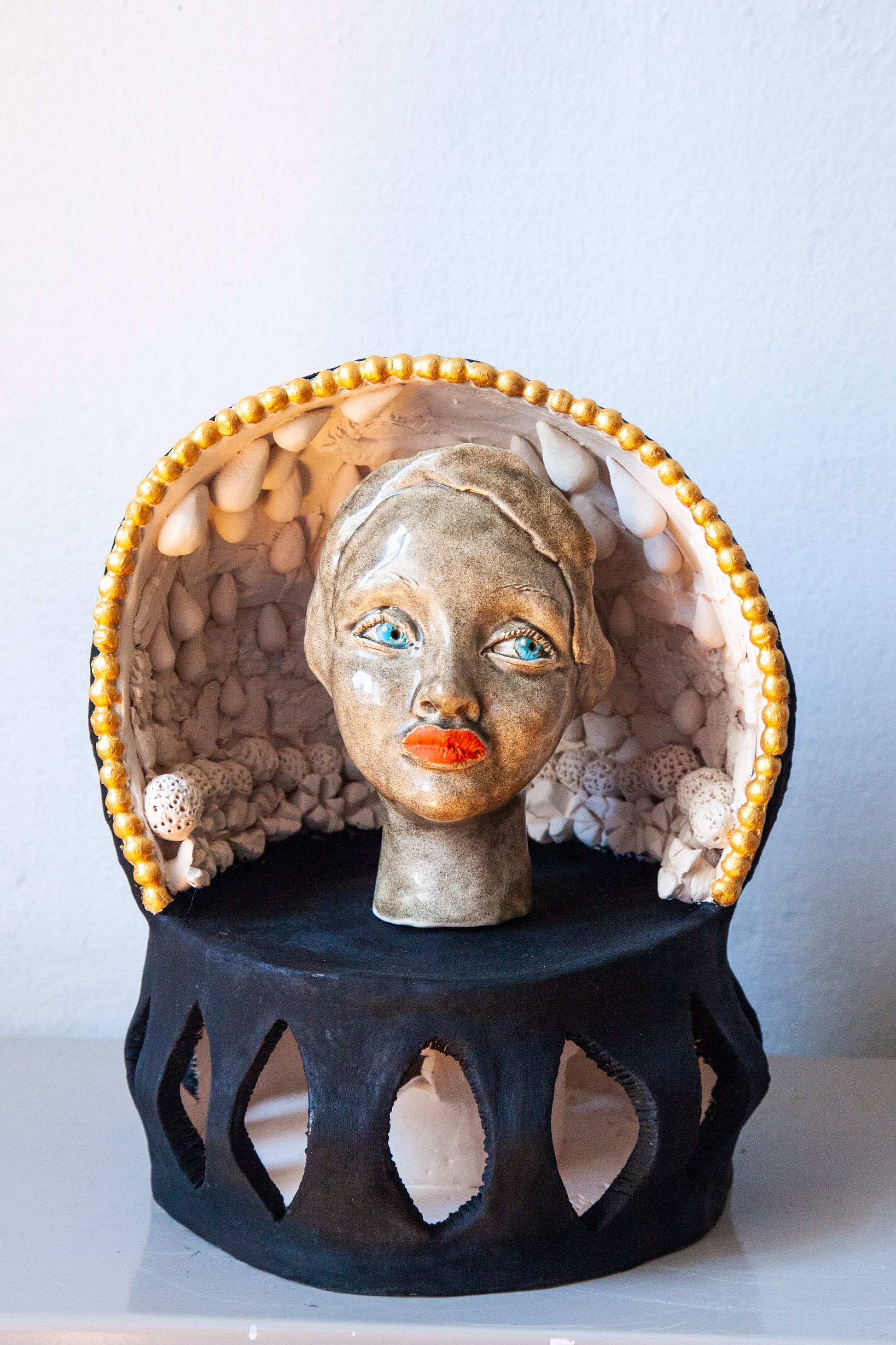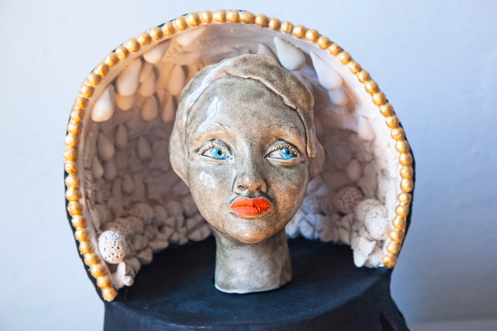 A unique handmade ceramic artwork, "Diana" belongs to the series called "Magic Boxes", original shells with fully-formed facial expressions.