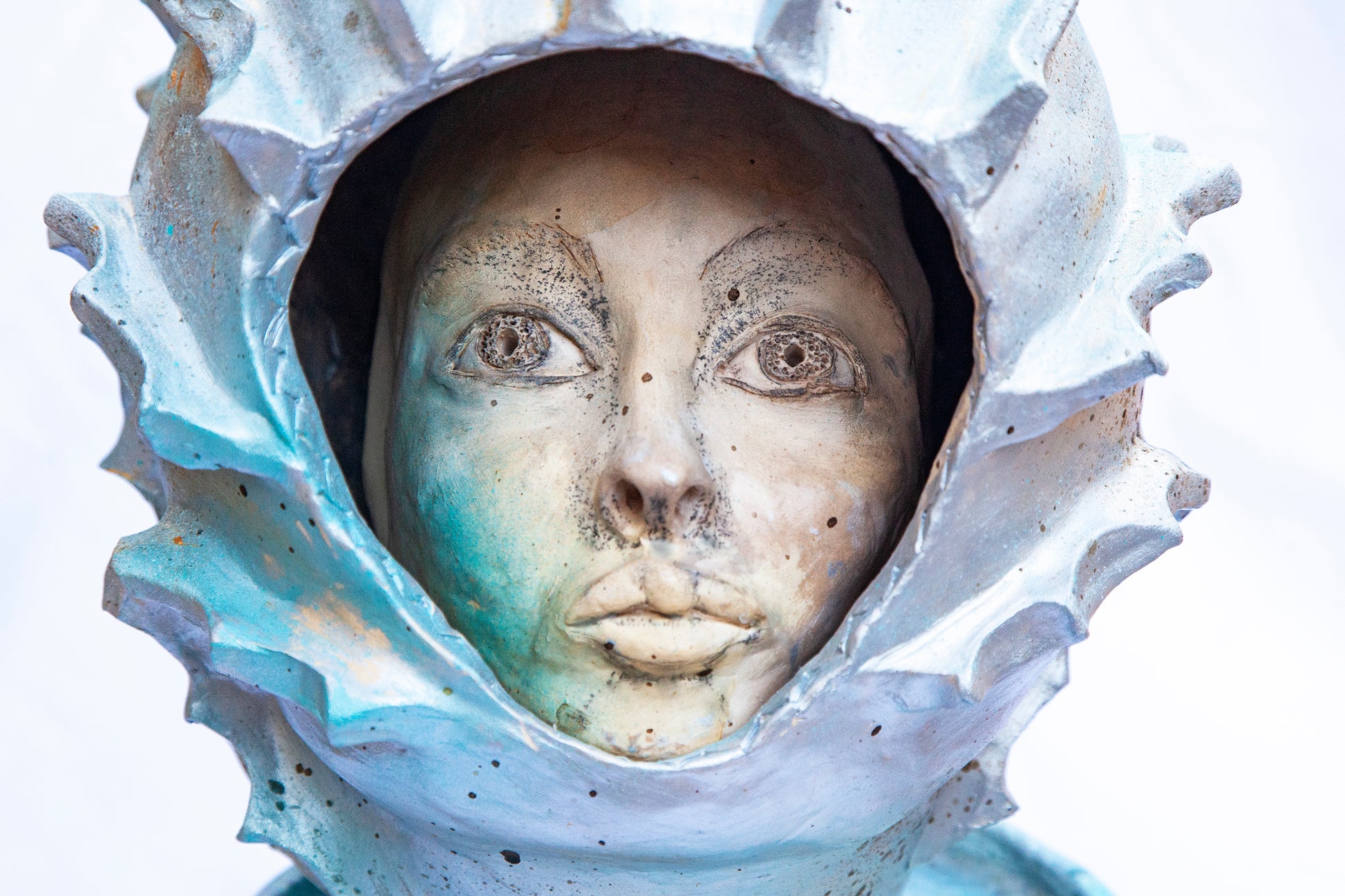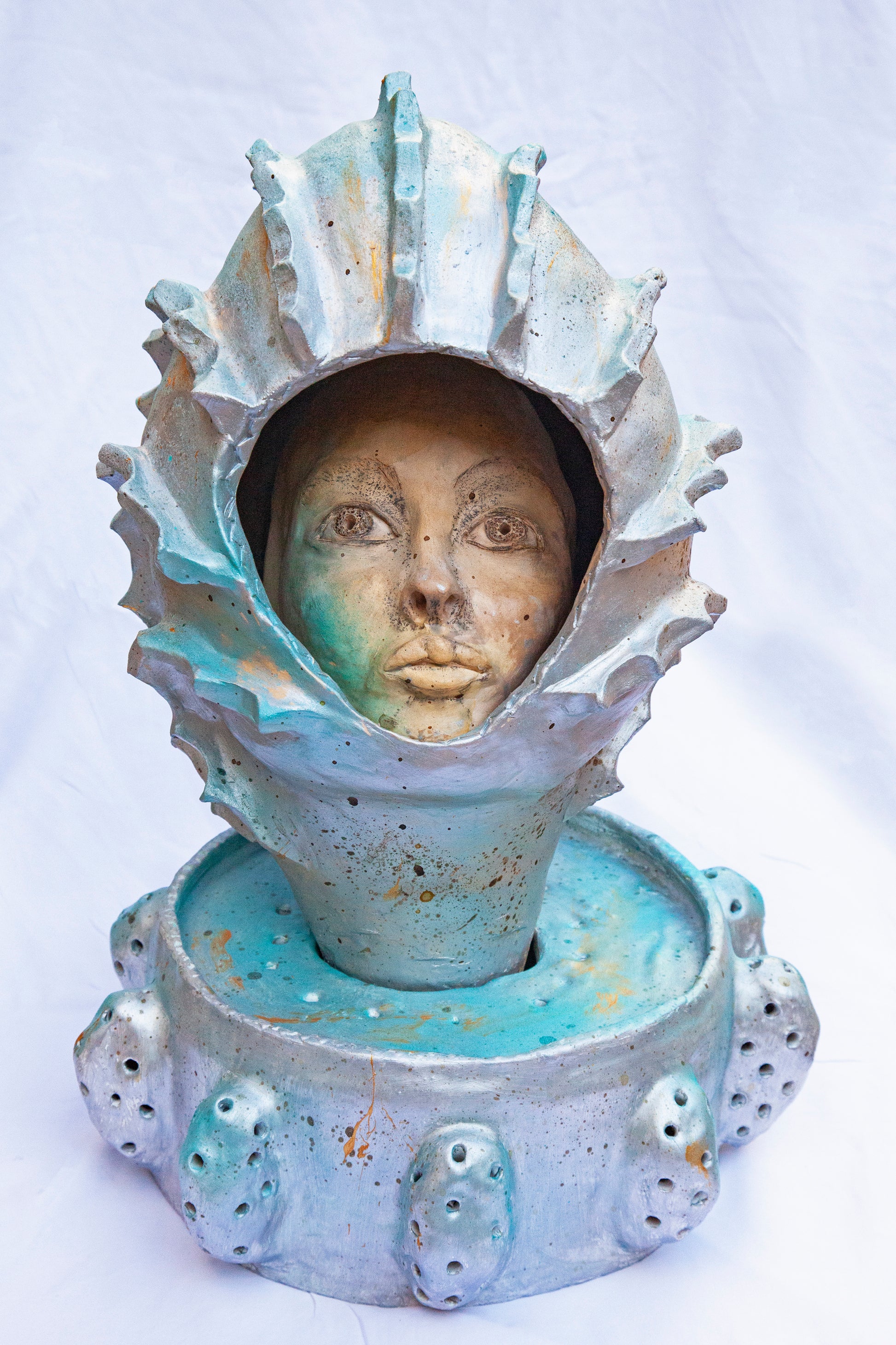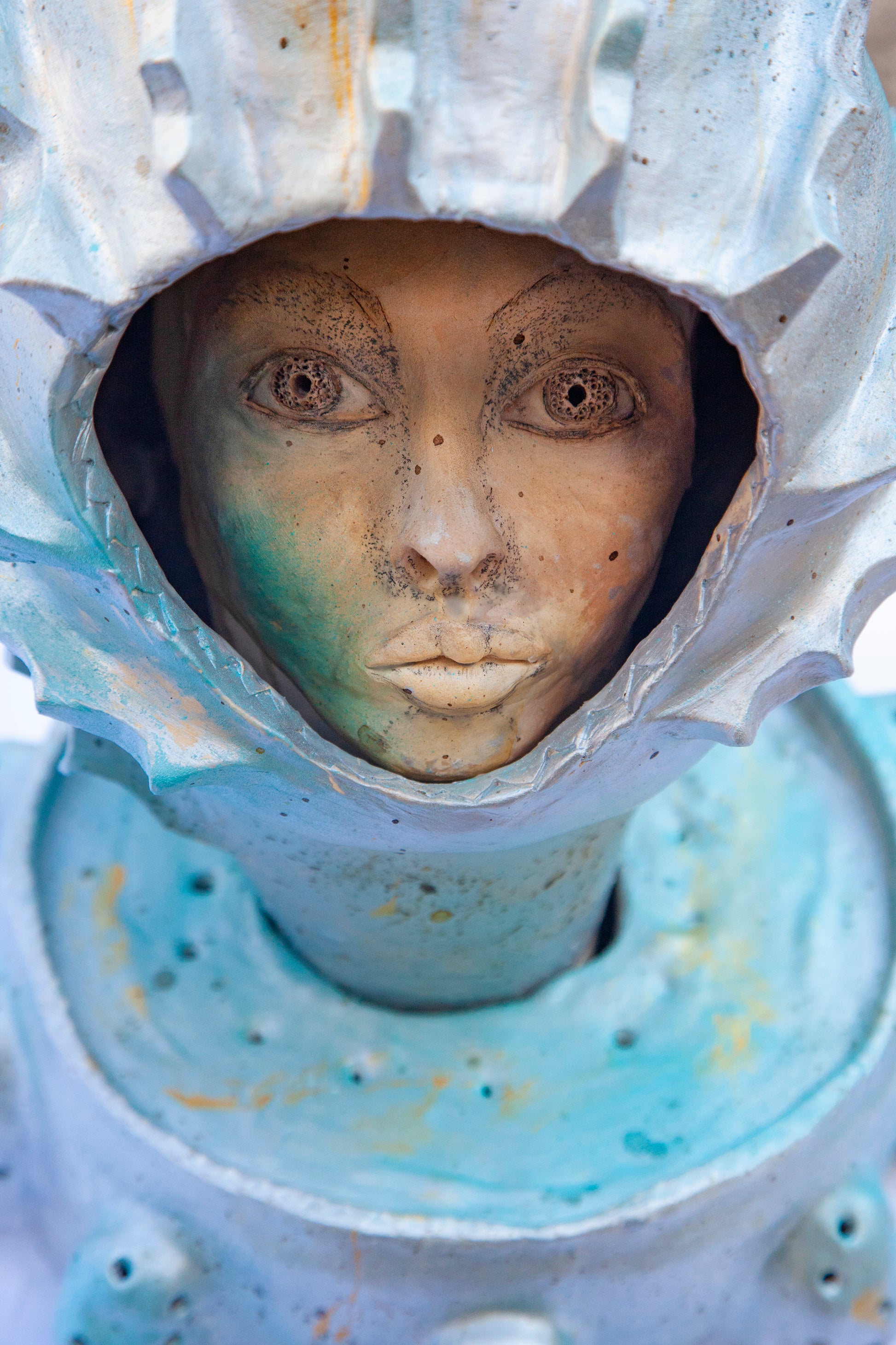A unique handmade ceramic artwork, "Iner Traveler" belongs to the series called "Magic Boxes", original shells with fully-formed facial expressions.
