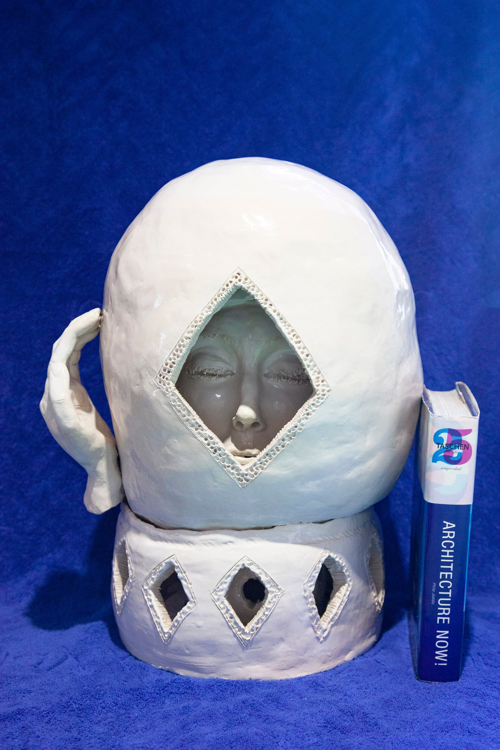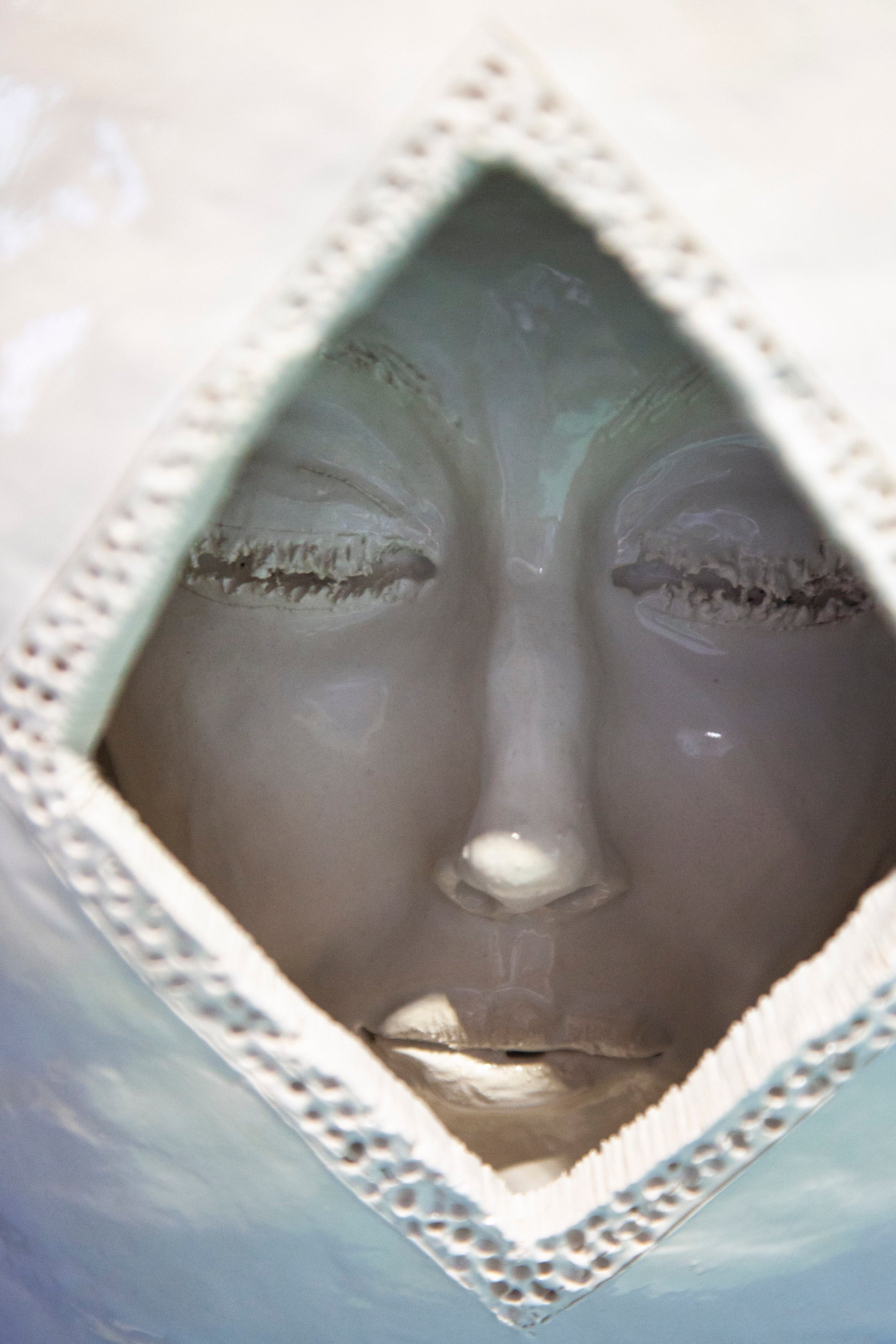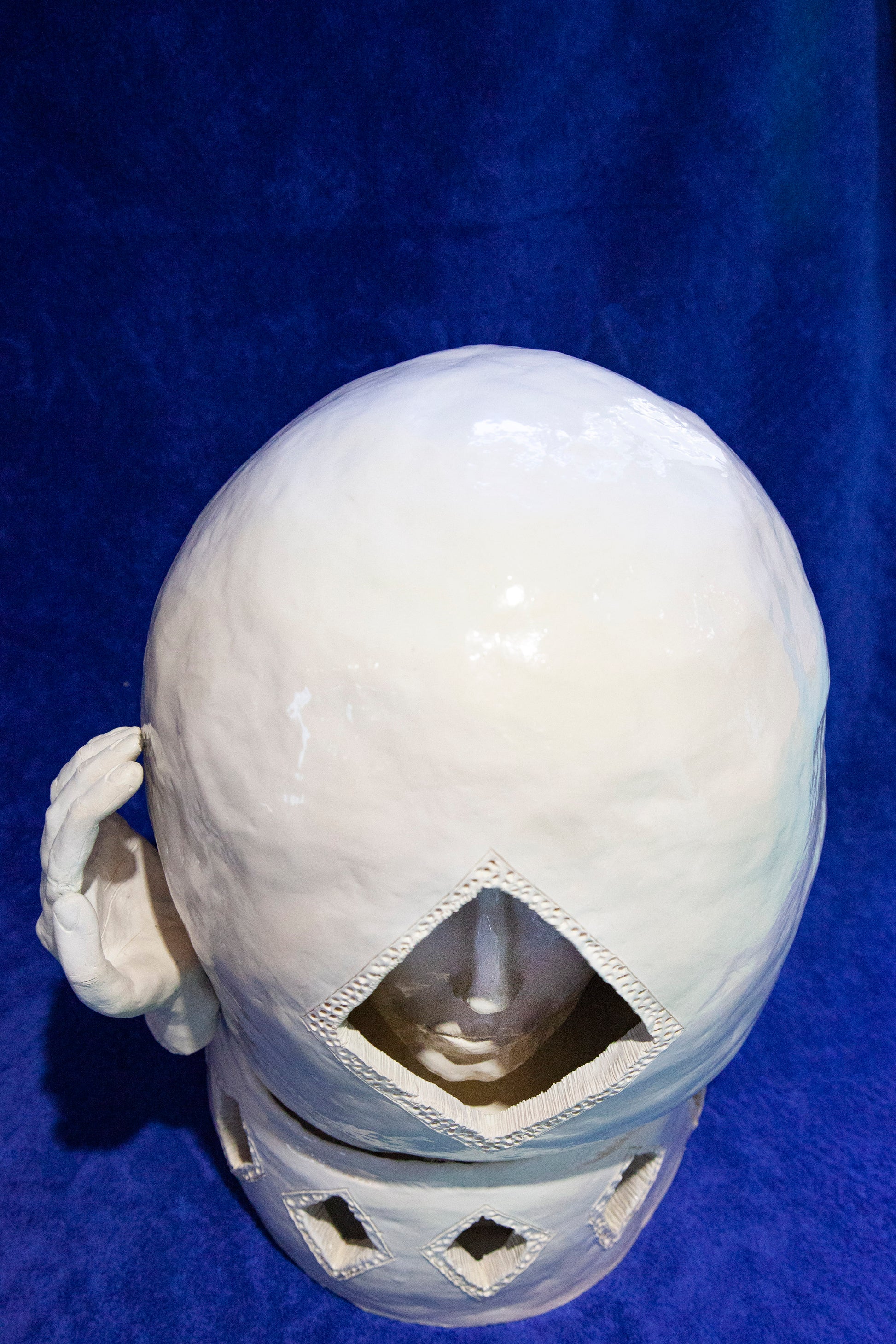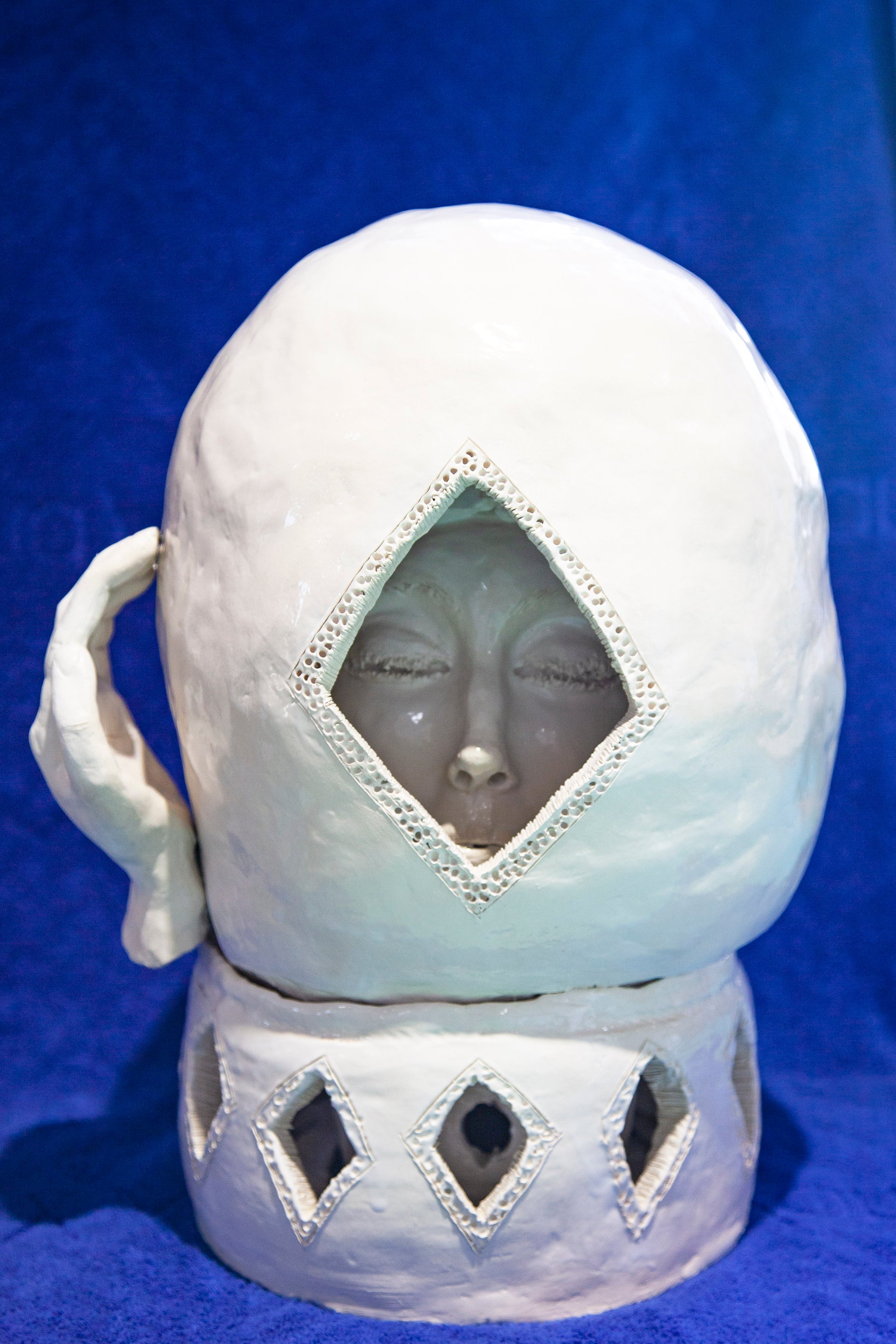 A unique handmade ceramic artwork, "Mano" belongs to the series called "Magic Boxes", original shells with fully-formed facial expressions.