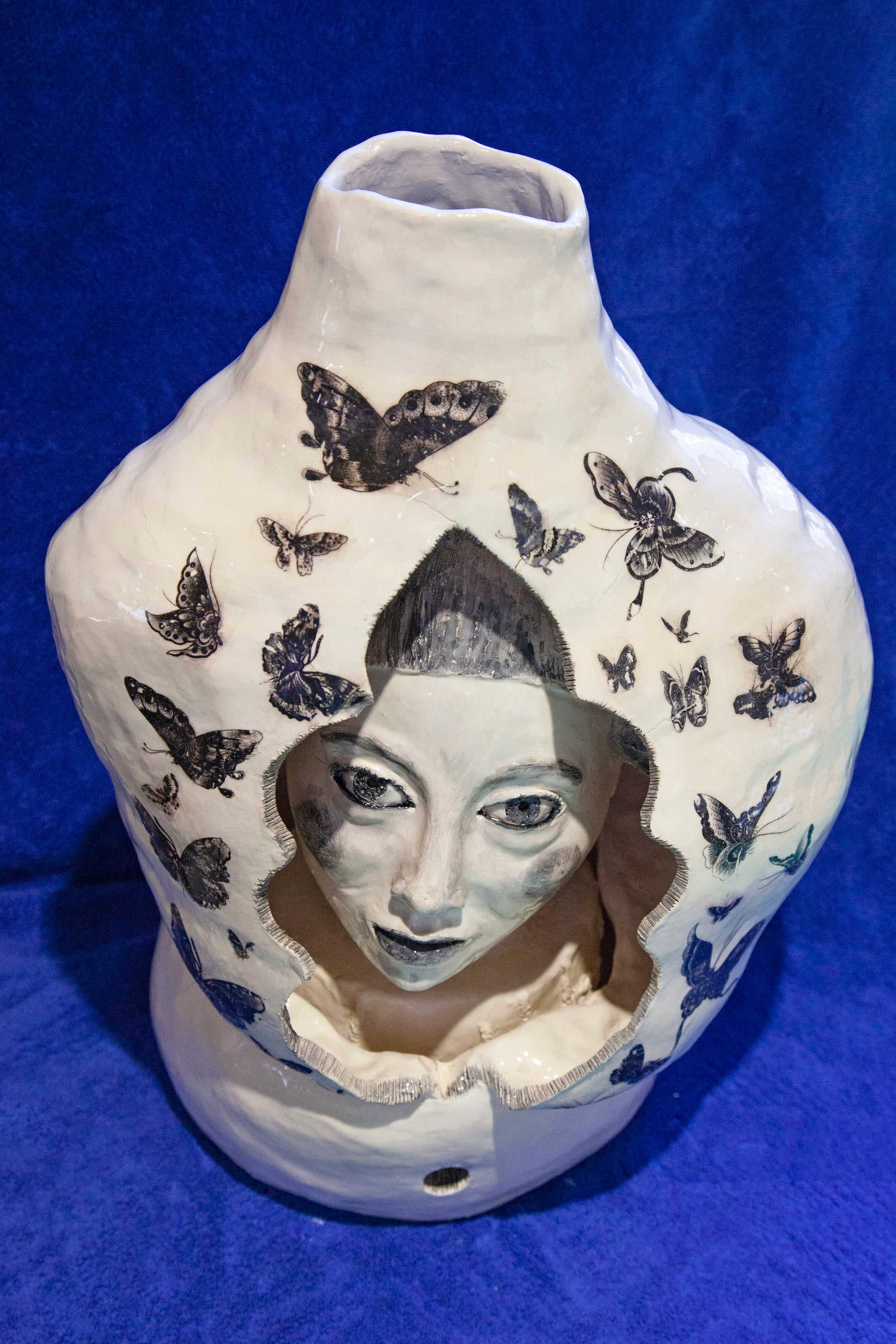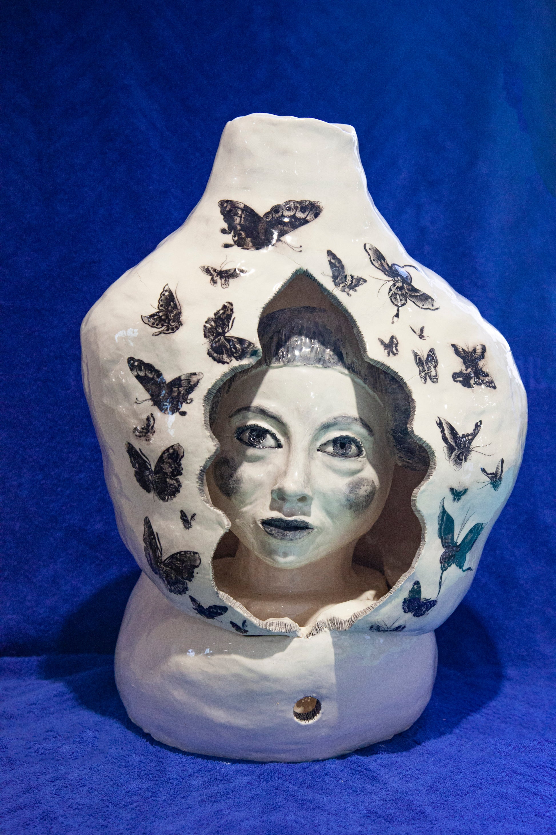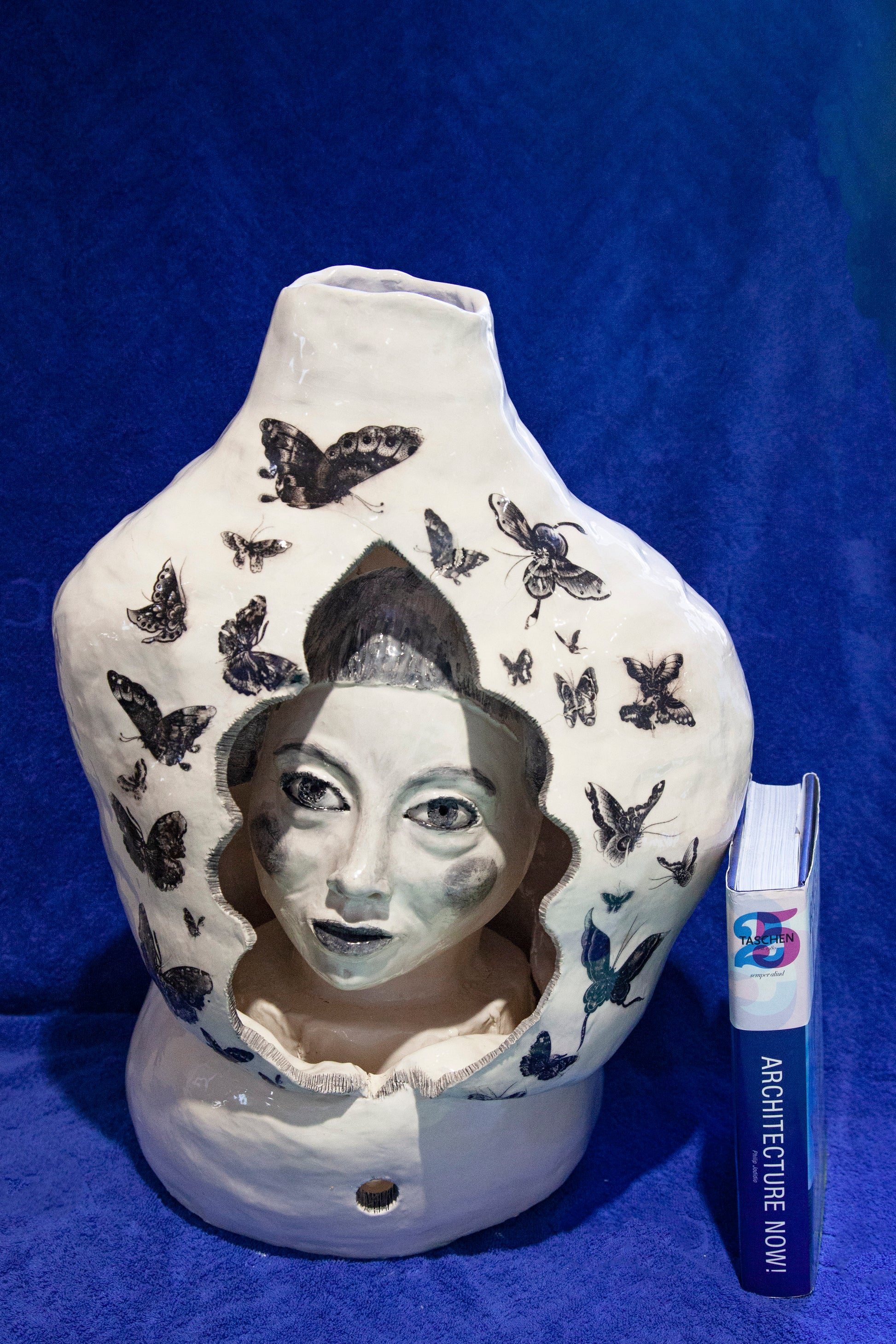 A unique handmade ceramic artwork, "Tango batterfly" belongs to the series called "Magic Boxes", original shells with fully-formed facial expressions.
